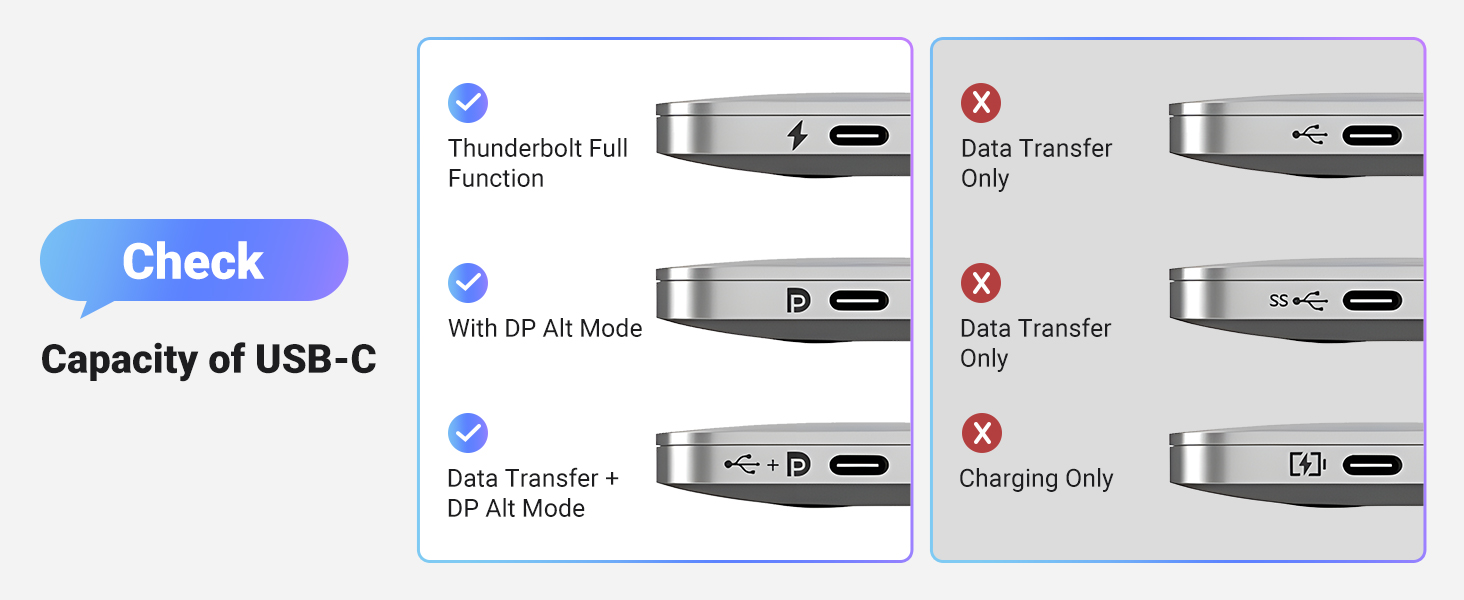 Important Note: To use the HDMI/DisplayPort, please ensure your device’s USB-C port supports Display Alt Mode for video output. Check the compatibility of your device specifications before purchase.