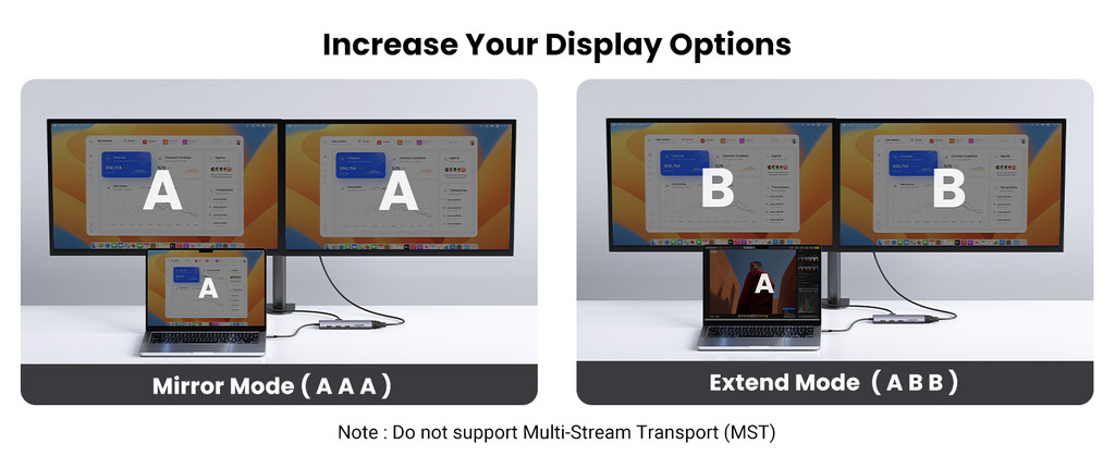 The 4K HDMI and 1080P VGA ports can be used for different display devices like monitor, TV, projector at the same time. The maximum output resolution reaches 4K 30Hz via HDMI and 1080P 60Hz via VGA. Mirror mode AAA and extended mode ABB are supported both on Mac and Windows